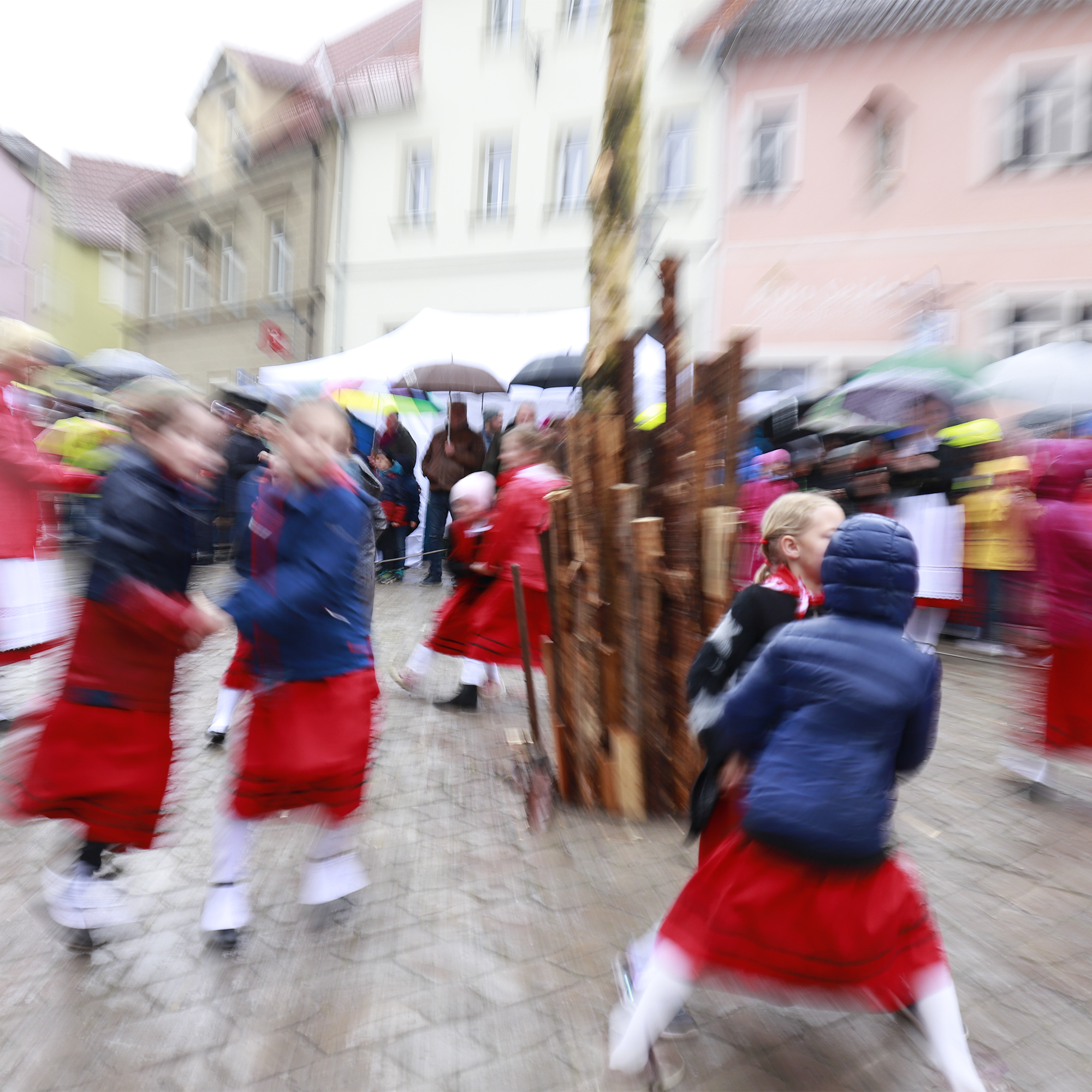 Zum traditionellen Maibaum Aufstellen versammeln sich zahlreiche Gäste gemeinsam mit den Bürgerinnen und Bürgern auf dem historischen Marktplatz in Iphofen.