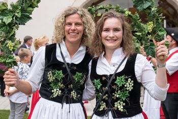 Doch wie sollten die Tänzerinnen und Tänzer gekleidet sein? Zur Begleitung der Tänzerinnen nahm man eine historische Anlehnung an die frühere weibliche Landjugend. Diese trugen eine eigene Tracht, bestehend aus rotem Rock, weißer Schürze und schwarzem, mit Weintrauben besticktem Mieder. Die Tracht wurde also kurzerhand zur Vorlage genommen, bzw. Fotografien aus früheren Zeiten. Während die Herren mit schwarzer Kniebundhose, weißem Hemd, roter Weste und dem klassischen fränkischen Dreispitz als Hut herausragten.