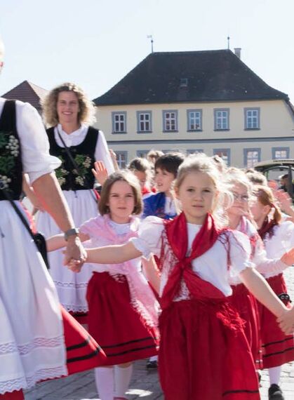... auf dem historischen Marktplatz Iphofen. Ein Highlight im Frühjahr ist mit dem Maibaum Aufstellen auch der Tanz in den Mai.
