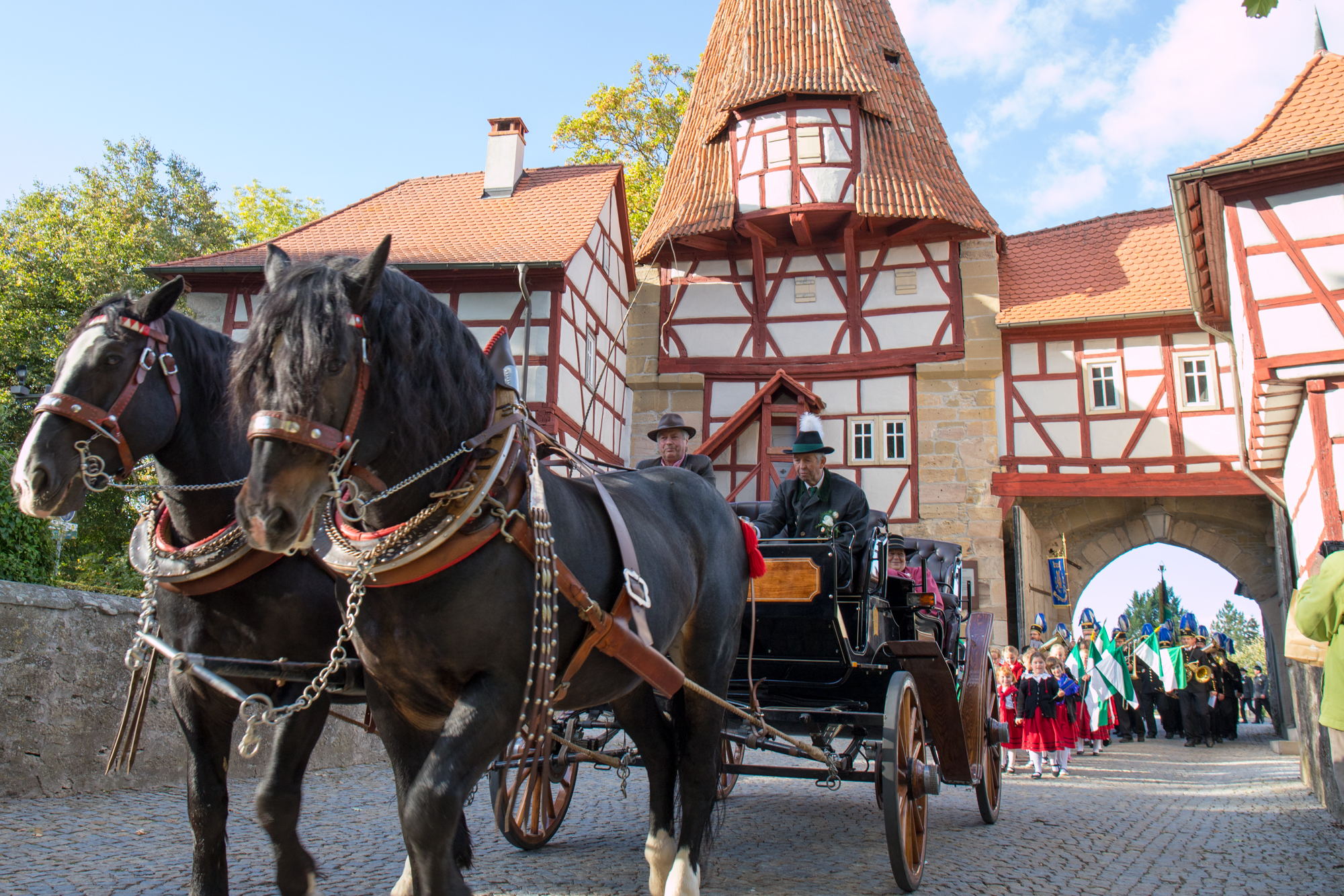 Beim sogenannten Schützenumzug, vom Schützenhaus zum historischen Rathaus, begleiten wir schon traditionell die alten und neuen Iphöfer Schützenhoheiten. Gegen 17 Uhr starten wir am Schützenhaus in Iphofen dabei umrahmen auch eine Kutsche mit Ehrengästen und die KNAUF Bergmannskapelle den festlichen Umzug. Auf dem Rathausbalkon werden die neuen Schützenhoheiten vorgestellt und dabei "lautstark" und mit Salutschüssen gefeiert. Im Anschluss begleiten alle Anwesenden sie zum gemeinsamen Umtrunk nach Hause.