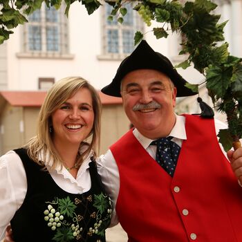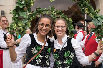 Doch wie sollten die Tänzerinnen und Tänzer gekleidet sein? Zur Begleitung der Tänzerinnen nahm man eine historische Anlehnung an die frühere weibliche Landjugend. Diese trugen eine eigene Tracht, bestehend aus rotem Rock, weißer Schürze und schwarzem, mit Weintrauben besticktem Mieder. Die Tracht wurde also kurzerhand zur Vorlage genommen, bzw. Fotografien aus früheren Zeiten. Während die Herren mit schwarzer Kniebundhose, weißem Hemd, roter Weste und dem klassischen fränkischen Dreispitz als Hut herausragten.